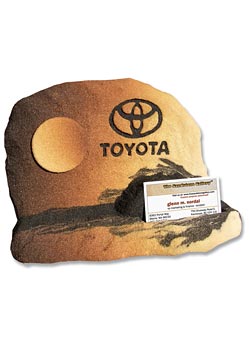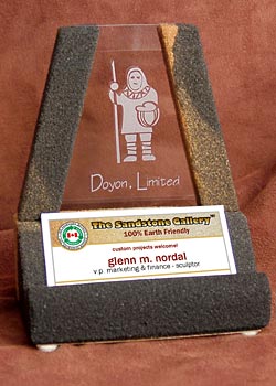 Sandstone Specialty Awards is here to take your next award presentation or promotional campaign or event to the next level. Every item we produce is a one of kind work of art with unique color and pattern combinations for each item. Our distinctive fired, hand carved and hardened 100% earth friendly sandstone awards, corporate gifts and promotional items are unmatched for customizing possibilities. Explore the possiblities with the photo gallery and accessory guide below and the Custom Guide.