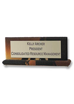 Our namebars add elegance to your business presentation. Each one is a unique as the person they represent with one of kind color and patterns in handcarved, hardened and fired sandstone and personalization plates available in full color with logo or traditional silver or bronze tone metal plates.