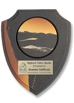 Sandstone Specialty Awards is here to take your next award presentation or promotional campaign or event to the next level. Every item we produce is a one of kind work of art with unique color and pattern combinations for each item. Our distinctive fired, hand carved and hardened 100% earth friendly sandstone awards, corporate gifts and promotional items are unmatched for customizing possibilities. Explore the possiblities with the photo gallery and accessory guide below and the Custom Guide.